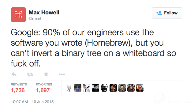 Google:虽然我们90%的工程师都在用你写的Homebrew,但这也并没有什么卵用,你连二叉树翻转都写不出,直接滚蛋吧!
