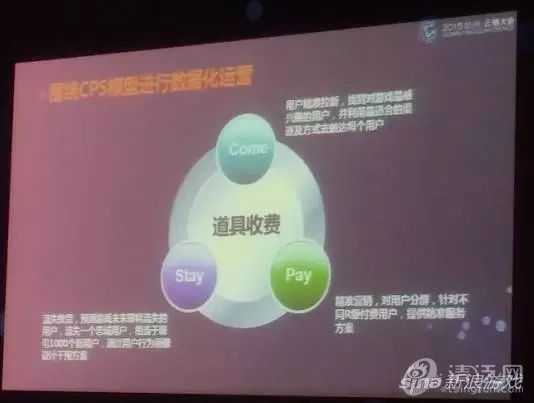 这是运营中的渠道的CPS,现在大家比较普通用到的是免费制的产品模式,实际上,在come、stay、Pay三个点上有不同的方面,come即所谓的用户画像,根据产品的分类以及产品的特点不同,会决定我们在产品投放模式上的不同。这是基于现在已经有的用户行为数据统计的基础上的。我们可以在这里做很多工作,比较有效地管理产品投放,我印象中,到上个月,基本的产品新进用户的次流可以保持在50%以上,这个产品本身品质比较好,另外我们一直在持续地优化导流的模型。