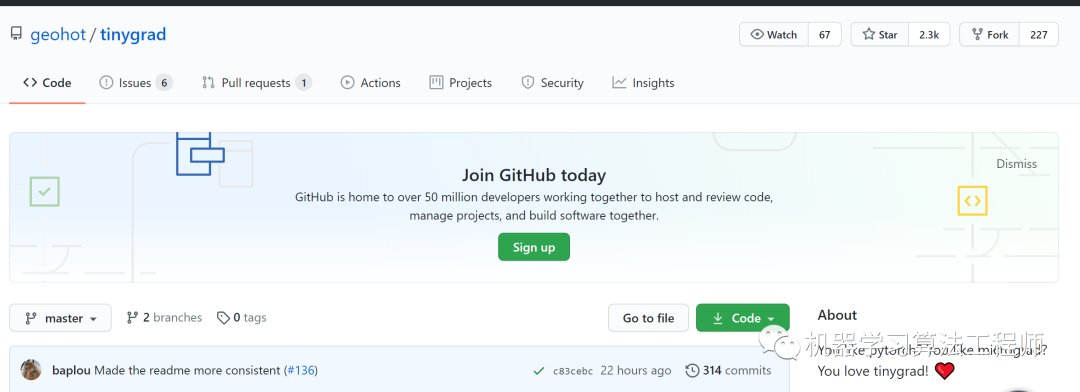 近期,一个不到1000行的深度学习框架tinygrad火了,麻雀虽小,但五脏俱全,这个深度学习框架使用起来和PyTorch类似,目前已经开源在GitHub上,而且收获了2.3K星: