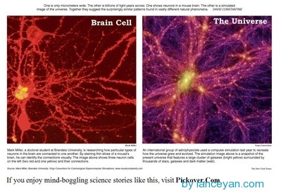 这是《纽约时报》刊登的2张照片,一张是老鼠的脑细胞(左),一张是宇宙(右)。早期宇宙中星系互连关系,和大脑神经元相互连接,几乎无法分辨两张图之间的不同,大脑细胞与整个宇宙拥有一样的结构。