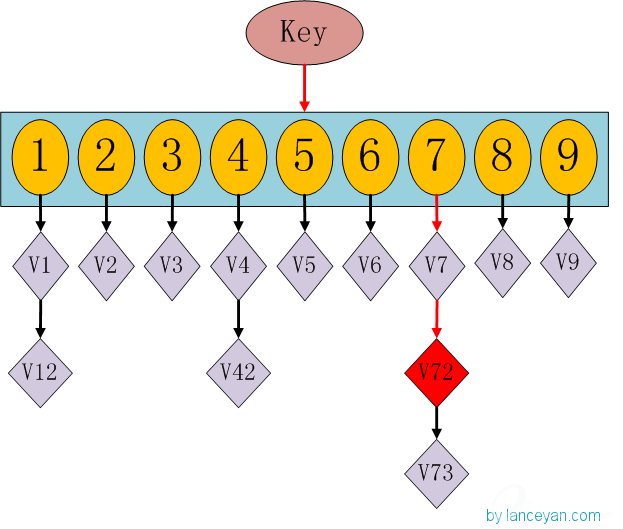 如果我们需要得到key对应的value,需要经过这些计算,传入key,计算key的hashcode,得到7的位置;发现7位置对应的value还有好几个,就通过链表查找,直到找到v72。其实通过这么分析,如果我们的hashcode设置的不够好,hashmap的效率也不见得高。借鉴这个算法,来设计我们的simhash查找。通过顺序查找肯定是不行的,能否像hashmap一样先通过键值对的方式减少顺序比较的次数。看下图: