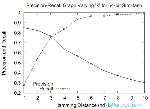 2、通过大量测试,simhash用于比较大文本,比如500字以上效果都还蛮好,距离小于3的基本都是相似,误判率也比较低。但是如果我们处理的是微博信息,最多也就140个字,使用simhash的效果并不那么理想。看如下图,在距离为3时是一个比较折中的点,在距离为10时效果已经很差了,不过我们测试短文本很多看起来相似的距离确实为10。如果使用距离为3,短文本大量重复信息不会被过滤,如果使用距离为10,长文本的错误率也非常高,如何解决?