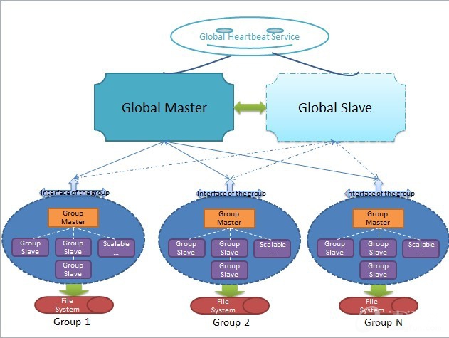 (4)每一个group的底层是实际的存储系统,File system,它们是无状态的,即,由分布式选举产生的Group Master可以在原来的File system上继续工作;