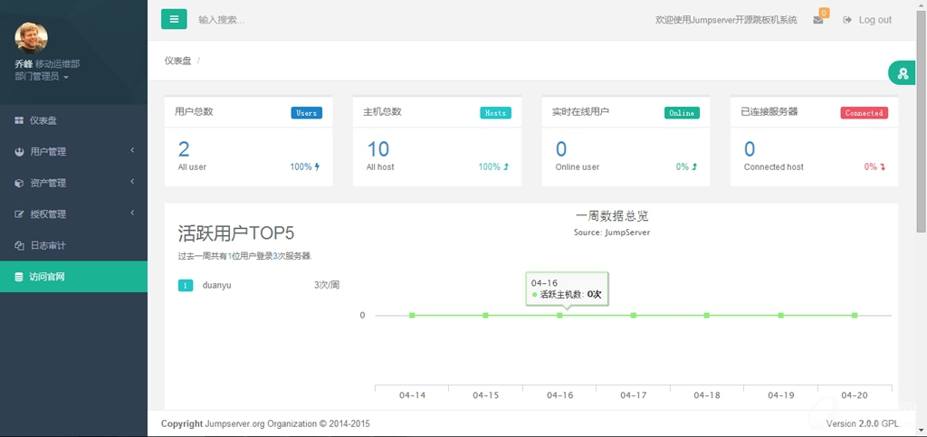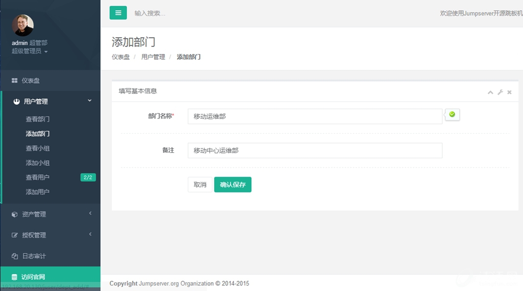 Jumpserver 2.0.0 版本中增加了部门管理员角色,可以负责管理一个部门的成员和该部门的主机,如果有需要请添加部门,如果服务器或用户较少可以不添加部门和部门管理员