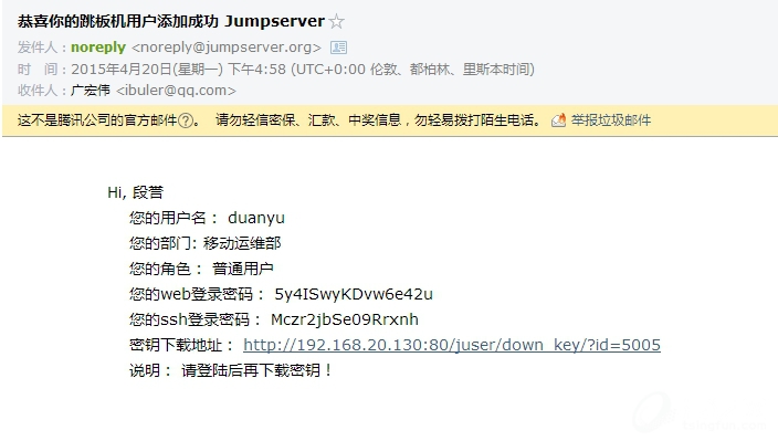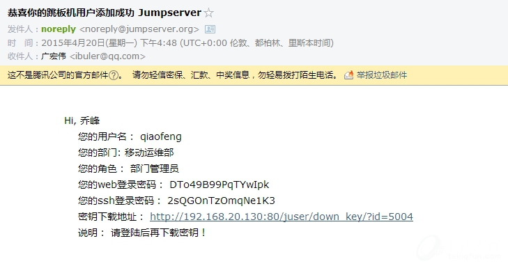 用户的web登录密码,ssh密钥密码等以邮件发送给所填写的邮箱