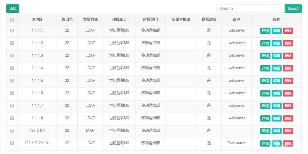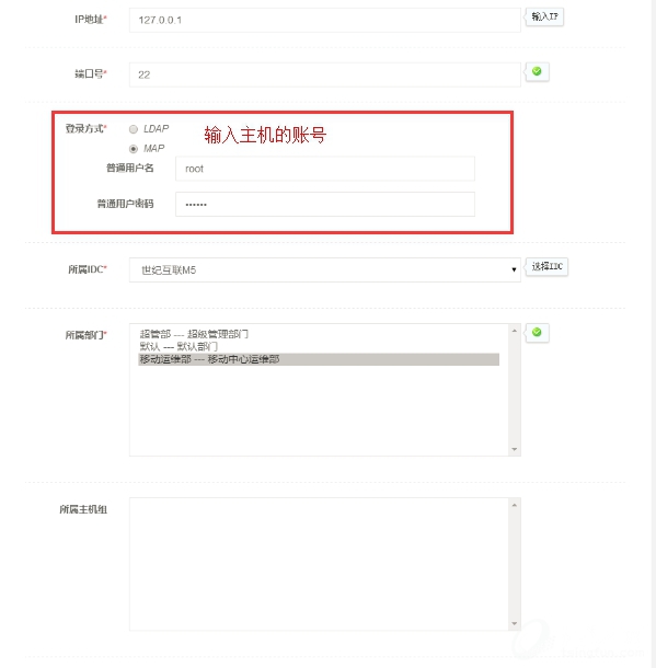 登录方式: 有两种,一中是LDAP也是最主要的方式,服务器需要安装ldap client,另一种是map,也就是映射,该模式用于不能安装ldap的机器,选择该模式后,需要手动填写主机的账号密码,用户从跳板机跳转到该服务器,会以这个用户登录