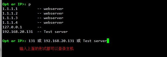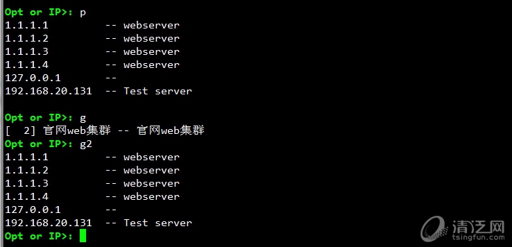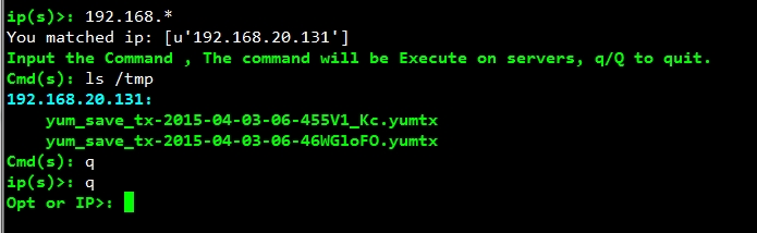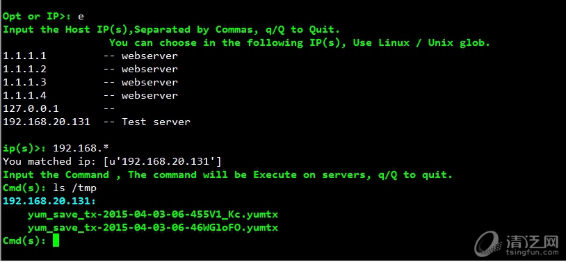 输入e 可以进入二级菜单批量在主机执行命令,根据提示输入IP,支持通配符,可以逗号分隔,下面输入执行的命令
