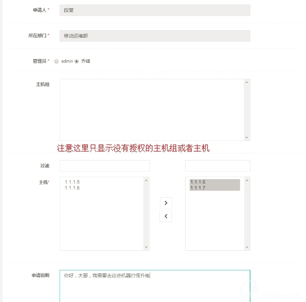 申请主机权限,可以选择申请的主机或者组,发邮件给管理员,管理员收到后会处理申请(对不起,目前申请处理还不是自动的)