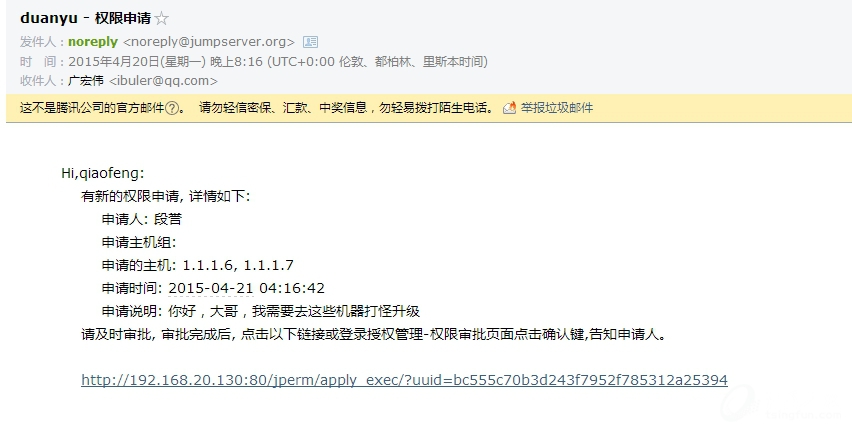 这时乔峰应该收到了邮件,可以点击链接,或者登陆jumpserver处理申请