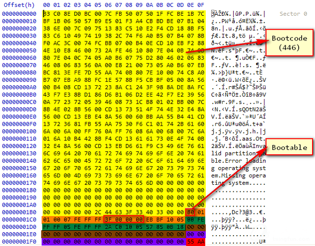 4、除了分区得到确认外,还能够确认系统启动分区的第一个磁盘簇。具体的值存储在启动代码的8th-12th字节。上图中这个值为3f 00 00 00,按照小端计算,其值为0000003f,即第63rd扇区。