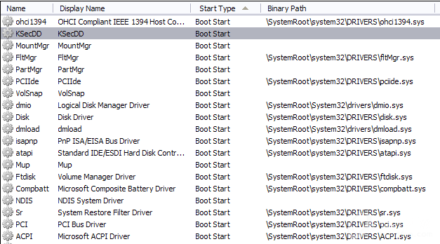 如果系统上次关闭时是睡眠状态,它将读取hiberfil.sys,以恢复睡眠前的数据。它还会加载启动驱动。操作系统的核心功能依赖这些驱动,下表列出了初始的系统驱: