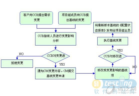 一般项目管理中,基线变更的控制权限是CCB(配置变更委员会)。基线变更控制一般是由两种变更方式,需求变更、内部变更。下图是基线变更的流程。