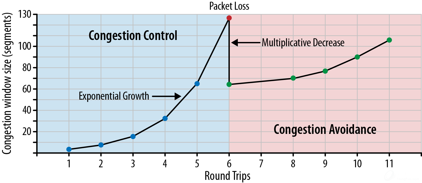 从慢启动的介绍中,我们能看到,发送方通过对「cwnd」大小的控制,能够避免网络过载,在此过程中,丢包与其说是一个网络问题,倒不如说是一种反馈机制,通过它我们可以感知到发生了网络拥塞,进而调整数据传输策略,实际上,这里还有一个慢启动阈值「ssthresh」的概念,如果「cwnd」小于「ssthresh」,那么表示在慢启动阶段;如果「cwnd」大于「ssthresh」,那么表示在拥塞避免阶段,此时「cwnd」不再像慢启动阶段那样呈指数级整整,而是趋向于线性增长,以期避免网络拥塞,此阶段有多种算法实现,通常保持缺省即可,这里就不一一说明了,有兴趣的读者可以自行查阅。