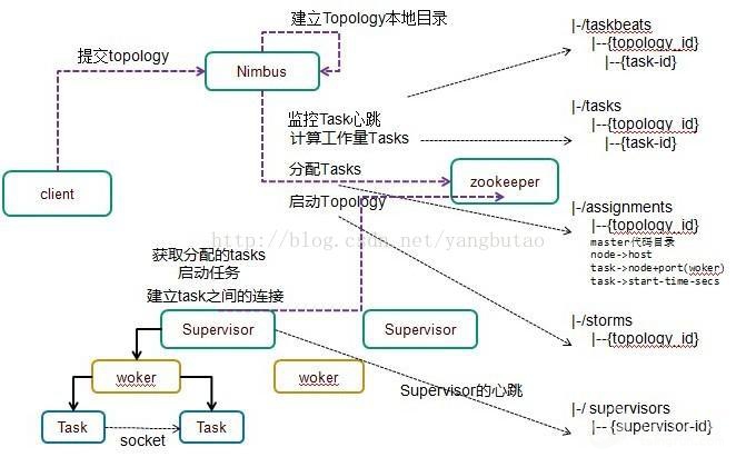 Supervisor去zookeeper上获取分配的tasks,启动多个woker进行,每个woker生成task,一个task一个线程;根据topology信息初始化建立task之间的连接;Task和Task之间是通过zeroMQ管理的;之后整个拓扑运行起来。