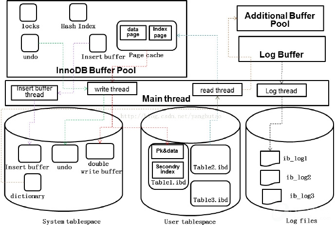在数据结构方面,innodb包括表空间、段、区、页/块,行。索引结构是B+tree结构,包括二级索引和主键索引,二级索引的叶子节点是主键PK,根据主键索引的叶子节点指向存储的数据块。这种B+树存储结构可以更好的满足随机查询操作IO要求,分为数据页和二级索引页,修改二级索引页面涉及到随机操作,为了提高写入时的性能,采用insert buffer做顺序的写入,再由后台线程以一定频率将多个插入合并到二级索引页面。为了保证数据库的一致性(内存和硬盘数据文件),以及缩短实例恢复的时间,关系型数据库还有一个checkpoint的功能,用于把内存buffer中之前的脏页按照比例(老的LSN)写入磁盘,这样redolog文件的LSN以前的日志就可以被覆盖了,进行循环使用;在失效恢复时,只需要从日志中LSN点进行恢复即可。
