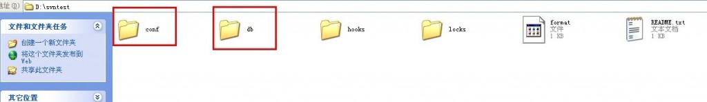 svntest 很像一个文件夹 如下图,注意 红框,每个数据仓库都会包含自己的conf和db文件夹。
