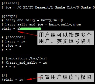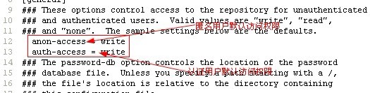 svn用户权限的配置可以到很精细的程度,自己去找资料看。这里只是很简单的略过。