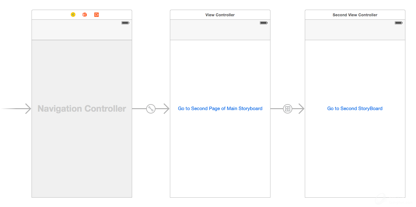 首先建立一个Single View Application, 在StoryBoard里添加2个UIViewController, 并且设置好导航关系