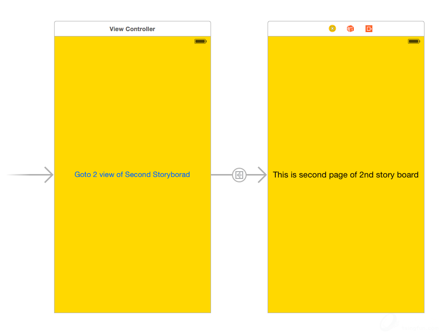 添加2个UIViewController, 并添加对应的按钮,将View的背景色改为黄色,以区别这是第二个UIStoryBoard, 按住Ctrl从第一个ViewController拖到第二个ViewController,选择Show