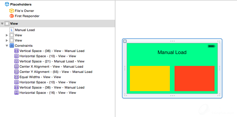 - 添加对应的约束,让两个UIView等宽,且Space都是10, 高度固定,且与周围的约速为10, 对UILabel也设置对应的约速,细节就不写了,看图
