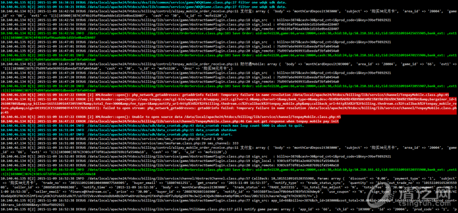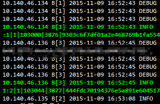 单个屏幕上所有服务器的日志实时滚动着显示。每条日志开头还标明日志的来源(下图)。