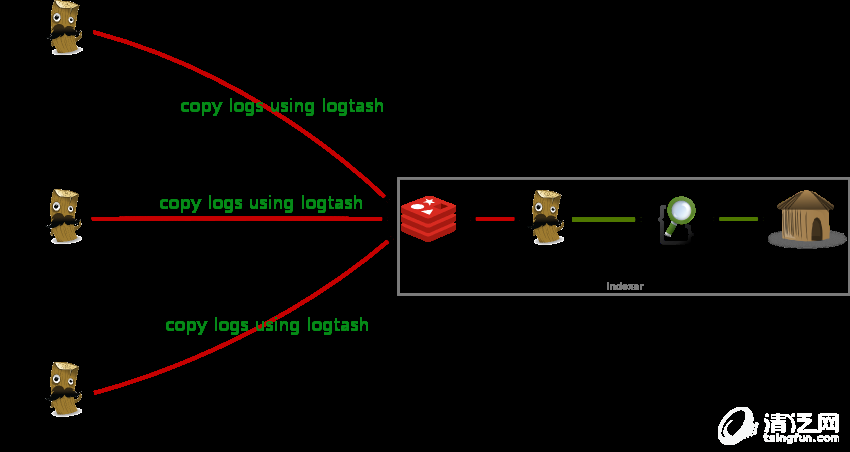 别看它只做3件事,但通过组合输入和输出,可以变幻出多种架构实现多种需求。这里只抛出用以解决日志汇总需求的部署架构图: