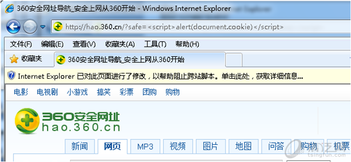 为了防止发生XSS, 很多浏览器厂商都在浏览器中加入安全机制来过滤XSS。 例如IE8,IE9,Firefox, Chrome. 都有针对XSS的安全机制。 浏览器会阻止XSS。 例如下图