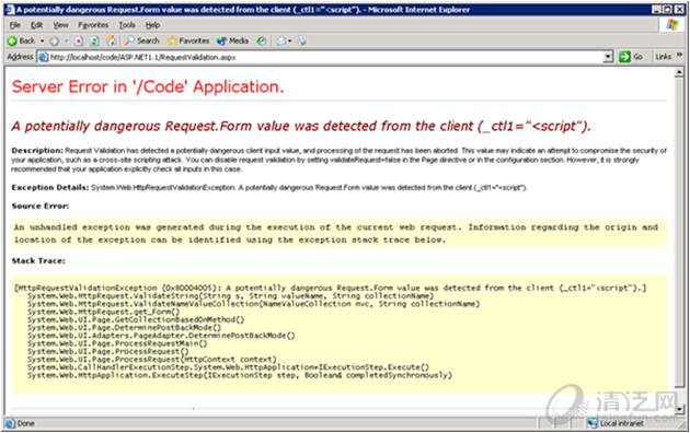 ASP.NET中有防范XSS的机制,对提交的表单会自动检查是否存在XSS,当用户试图输入XSS代码的时候,ASP.NET会抛出一个错误如下图