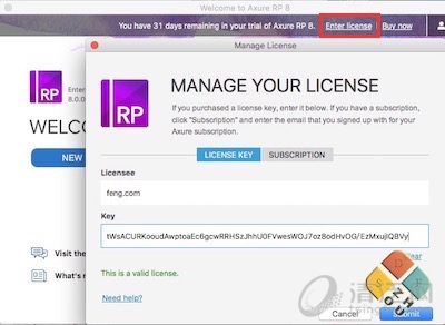2.打开应用程序中的“Axure RP 8.app”,点击“Enter license”弹出注册框;