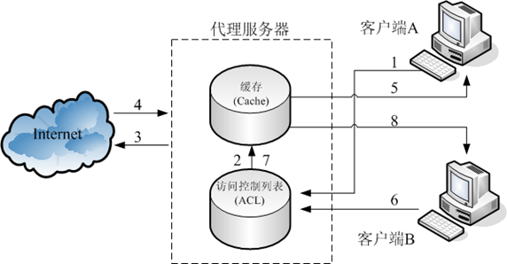 ② 代理服务器接受到请求后,首先与访问控制列表中的访问规则相对照,如果满足规则,则在缓存中查找是否存在需要的信息。