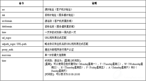 列表类型:是可被Squid识别的类别。Squid支持的控制类别很多,可以通过IP地址、主机名、MAC地址和用户/密码认证等识别用户,也可以通过域名、域后缀、文件类型、IP地址、端口和URL匹配等控制用户的访问,还可以使用时间区间对用户进行管理