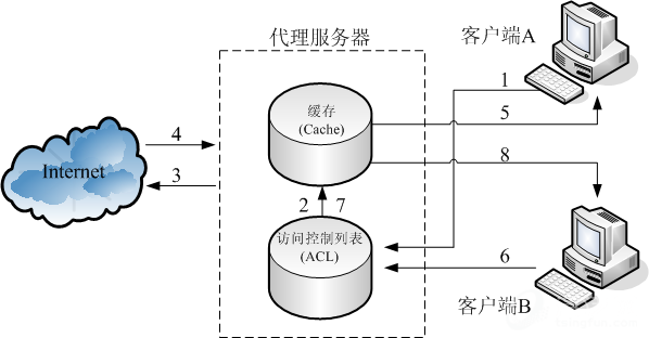② 代理服务器接受到请求后,首先与访问控制列表中的访问规则相对照,如果满足规则,则在缓存中查找是否存在需要的信息。