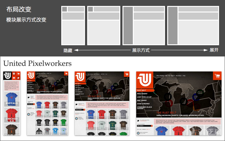 2. 可切换的固定布局:同样以像素作为页面单位,参考主流设备尺寸,设计几套不同宽度的布局。通过设别的屏幕尺寸或浏览器宽度,选择最合适的那套宽度布局;