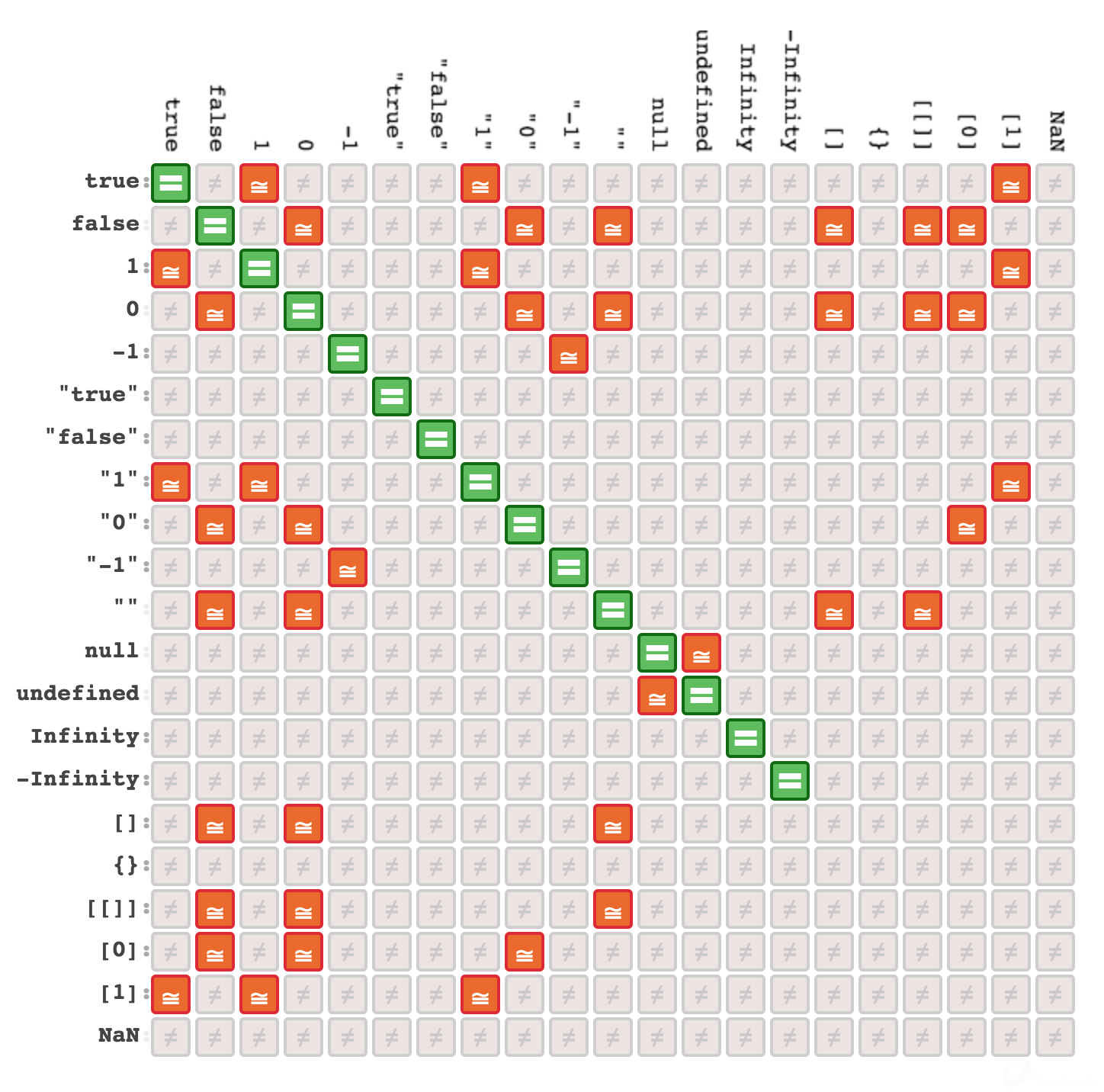有时JavaScript的等价比较是一件抓狂的事情,看看这个表格就一目了然了。