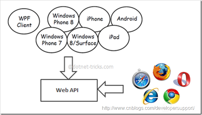 Web API最重要的是可以构建面向各种客户端的服务。另外与WCF REST Service不同在于,Web API利用Http协议的各个方面来表达服务(例如 URI/request responseheader/caching/versioning/content format),因此就省掉很多配置。