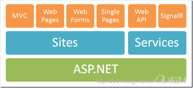 Web API在ASP.NET完整框架中地位如下图,与SignalR一起同为构建Service而服务的框架。Web API负责构建http常规服务,而SingalR主要负责的是构建实时服务,例如股票,聊天室,在线游戏等实时性要求比较高的服务。