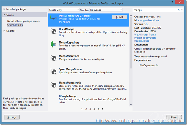 2. Mongo DB C# driver下载可以在nuget搜索mongocsharpdriver。