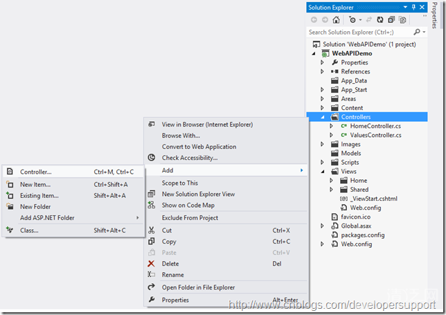 然后项目就创建成了,Controllers里面有一个ValuesController,是自动生成的一个最简单的Web API Controller。