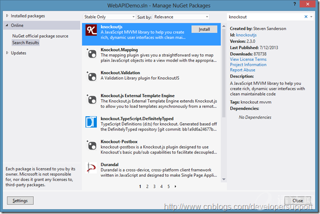 4. Knockoutjs下载可以在nuget搜索knockoutjs。