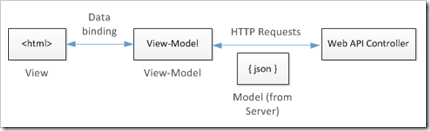 Knockoutjs通过MVVM模式来实现动态html绑定数据,如下图,其中View-Model是客户端的javascript object保存的model数据。