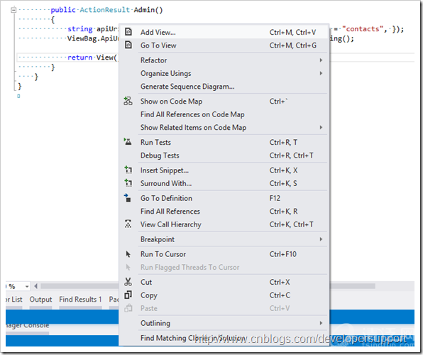 先打开HomeController,里面添加一个新的Action代码如下,因为我们要在MVC中对于ContactsController添加对应的View。