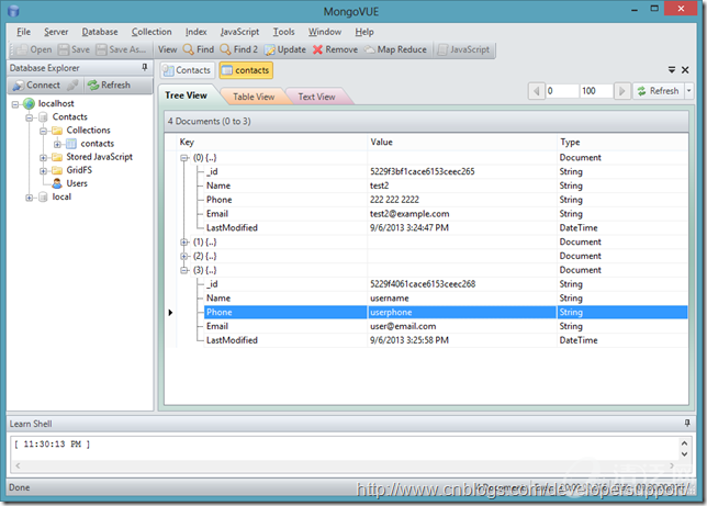 通过前面安装的mongovue来查看下DB种的数据,先添加的user也在其中,令我感到欣慰。。。